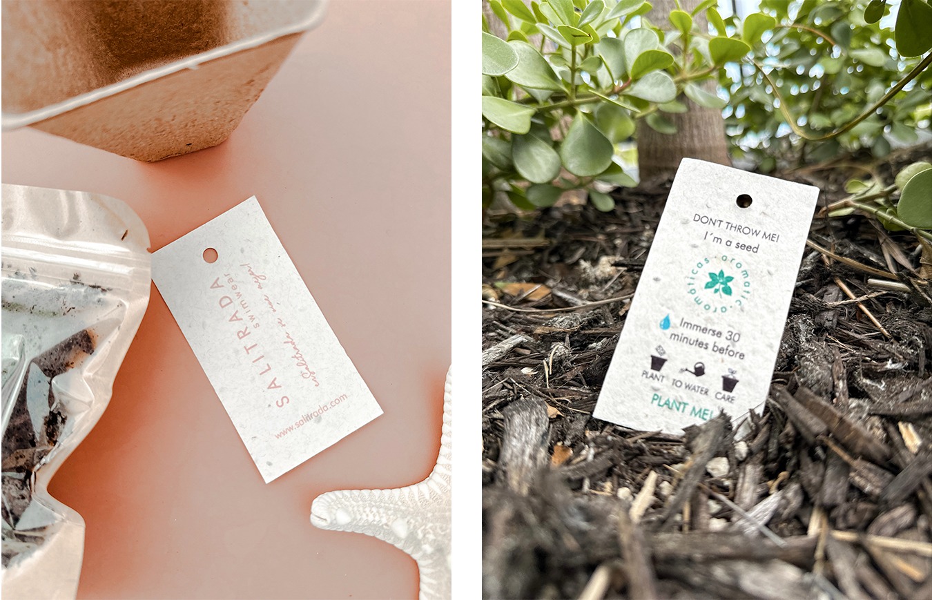 Nuestra Etiquetas – Tag Plantables Nuestras etiquetas están fabricadas con papel reciclado hecho a mano, además ellas están cargadas con semillas que pueden germinar y crecer una vez plantadas en la tierra. Estas etiquetas tienen un propósito adicional: reforzar mensajes positivos y fomentar prácticas ambientalmente responsables. Nuestras etiquetas: son reciclados, reciclables, biodegradables, compostables ¡y plantables! En lugar de desechar estas etiquetas, te invitamos a plantarlas. Recibirás flores coloridas o plantas aromáticas en tu jardín o maceta. Es una pequeña acción que genera un impacto positivo en el medio ambiente y que te recompensa con belleza natural. ¡Así que no las tires, plántalas! |